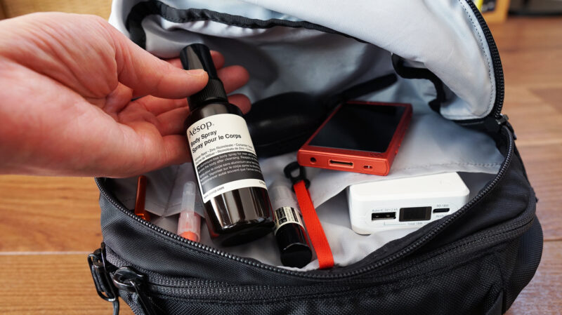こういった感じでモバイルポーチや音楽プレーヤーなどのガジェット類。リップクリームやハンドクリームなどのケア小物。ペン類などのステーショナリーを収納する事ができ、便利に作られている。