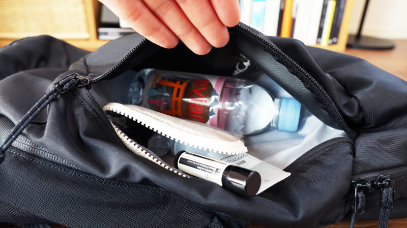 こちらはバックパック上部のミニポケット。容量としてはペットボトル1本が入る程度。このポケットには数種類スリーブが用意されていて、小物を各部に収納できるようになっている。